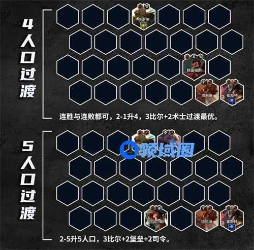 连胜就2-1升4,2-5升5人口,过渡3比尔+2术士+2司令+2堡垒最优。