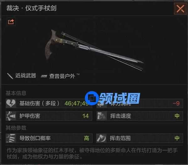 作为一把细长的利刃,手杖剑拥有中等的攻击范围和挥击速度,配合三段式刺击与较高的基础伤害,可以在中近距离释放不俗的爆发力,锐器特有的高创口概率则能保证给侥幸逃脱的敌人留下一身“临别赠礼”。