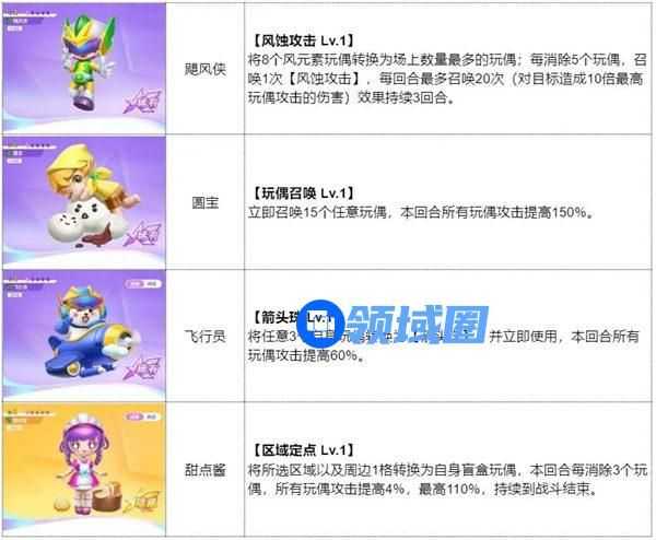 阵容核心是飓风侠,利用飞行员的消除效率频繁触发飓风侠的风蚀攻击,甜点酱加攻击BUFF,最大化飓风侠的风蚀攻击伤害,圆宝可替换成其他风属性玩偶,因为圆宝是新手送的玩偶,所以选择了他。