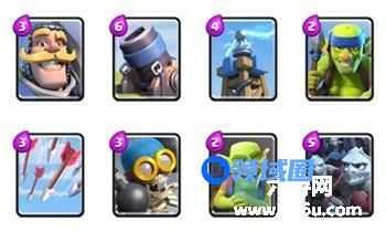 卡组阵容:骑士+迫击炮+电塔+哥布林投手+箭雨+炸弹人+哥布林+亡灵军团(苍蝇群)
