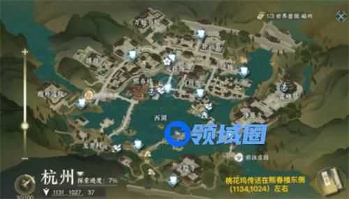3、拍摄完毕后来到杭州,坐标(1134.1024)处找到小桃枝就可以进入桃花坞了。
