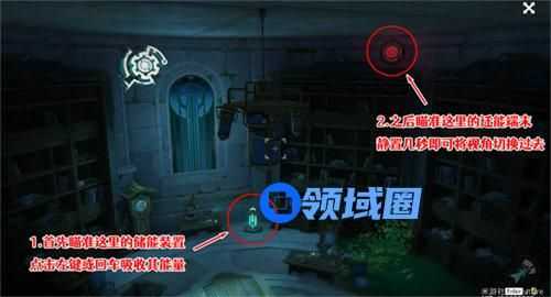 (1)先瞄准底部【储能装置】,点击左键或回车吸收其能量,之后瞄准对面墙上的【迁能端末】,静置几秒将视野切换过去。