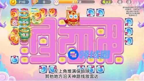 4、之后天神来了再左上角堆满保龄球,其他的按天神的移动路线来放雷达,今天的路中间是放不了炮塔的,所以天神只要贴边走就可以高分,还是有运气的。