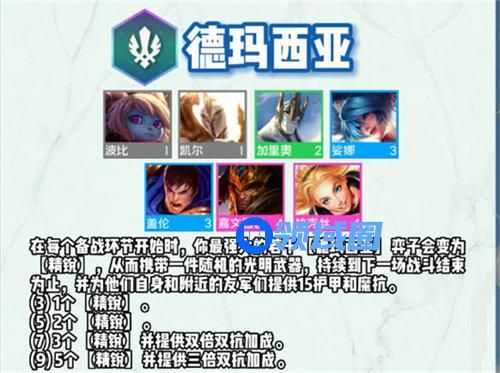 效果:云顶s9德玛西亚羁绊介绍备战环节开始,你最强大的若干德玛西亚弈子会变为精锐,从而携带一件随机光明装备,持续到战斗环节结束为止。并为自身和附近友军提供15双抗(不可叠加)