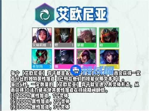 效果:每个艾欧尼亚弈子都会获得一定的属性加成,每4秒,一定数量的艾欧尼亚弈子会进入灵体状态,从而获得30法力值并使其属性在灵体期间翻倍。