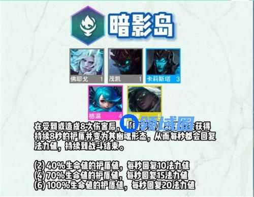 效果:在受到或造成伤害8次后暗影岛弈子会获得持续8秒的护盾并变为其幽魂形态,从而每秒都会回复法力值,持续到战斗结束。