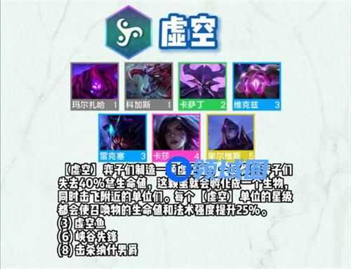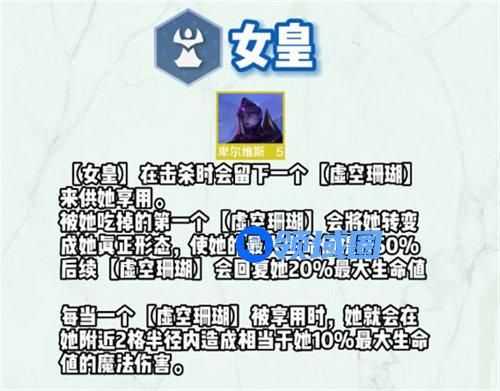 1、召唤一颗虚空蛋一旦你的弈子们天云40%总王市值,这颗蛋就会孵化出一个生物,同时击飞附近的单位,每个虚空单位的星级都会使召唤物的生命值和法强提升25%;