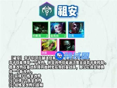 祖安弈子们可以制造仅有他们能用的炼金改件,弈子仅能携带一个改件,并且改件可以够通过售出该弈子来移除,如果改件在备战阶段开始时处于你的备战席,那么它将会转换成一个新的改件。