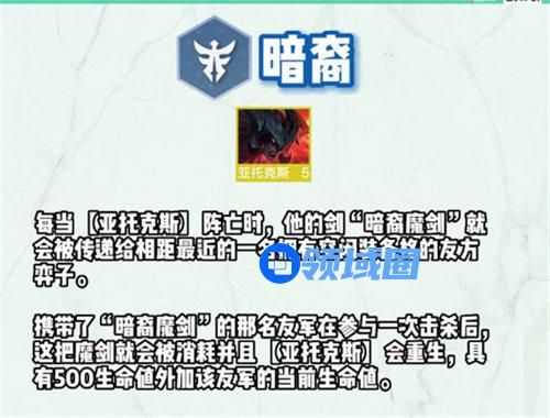 每当亚托克斯阵亡时,他的剑“暗裔魔剑”就会被传递给相距最近的一名拥有空闲装备格的友方弈子。