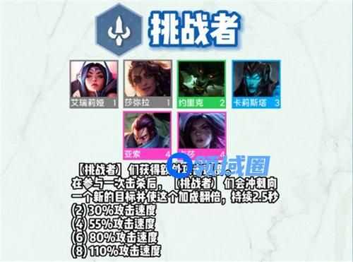 挑战者们获得额外攻击速度。在参与一次击杀后,挑战者们会冲刺向一个新的目标并使这个加成翻倍,持续2.5秒