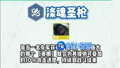 每当一名友军获得护盾时,你最强大的那个[赛娜]就会为其提供可叠加的10%攻击速度,持续到战斗结束