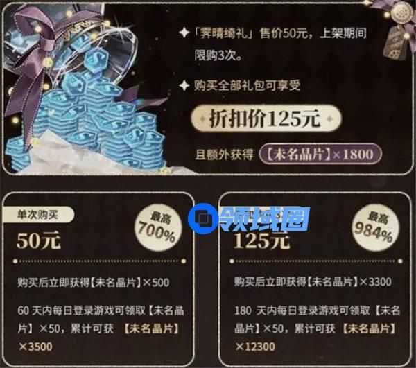 11月9日更新后,新增「霁晴绮礼」礼包。购买全部礼包最高可享受984%收益。
