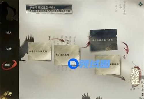 1、首先去磁州驿站听旁人说话,然后打开线索簿推理事情的经过。纸片点击可翻转,正确顺序如下: