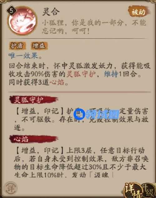 回合结束时,怀中灵狐激发妖力,获得能吸收攻击90%伤害的灵狐守护,维持1回合。同时获得3道心焰。