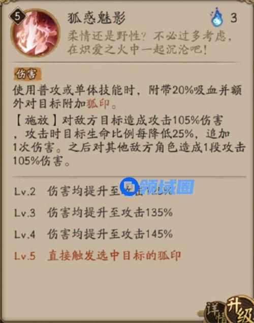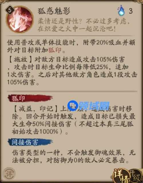 使用普攻或单体技能时,附带20%吸血并额外对目标附加狐印。