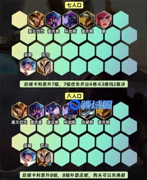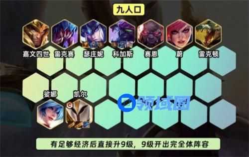 有足够经济后直接升9级,9级开出完全体阵容6格斗3德玛2裁决