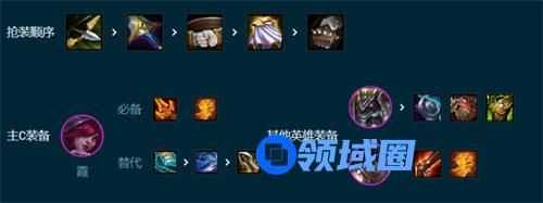 霞作为主C,尽可能装备提供更多的攻击力,因为艾欧尼亚自带回蓝,征服者自带技能暴击,狗头带了薄暮法袍可以破甲,副C妮菈攻速装备和吸血即可
