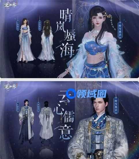 男装【云心儒意】则将谪仙岛的云彩化用在了身上,深处的云沉寂庄严,浅处的云灵动自由,以深浅色的星纱布料,描绘出云的灵动多姿。