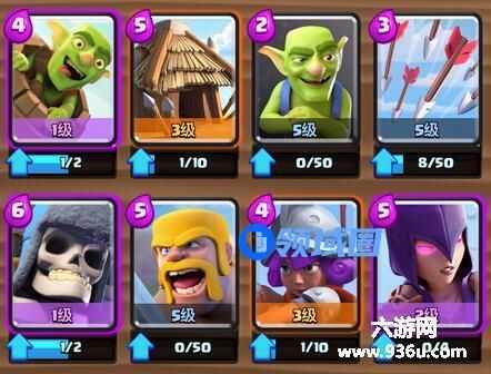 卡组阵容:飞桶+哥布林小屋+哥布林+箭雨(万箭齐发)+骷髅巨人(大骷髅)+女巫+野蛮人+火枪手