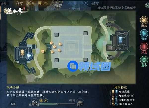 双方的军旗室中各有一面军旗,只要:一前往对方基地扛起军旗、二携带对方军旗返回己方军旗处、三且此时我方军旗仍在原处,即可完成一次夺旗。率先完成两次夺旗便可提前获胜!若夺旗数平局,6分钟时结束比赛,依次对比双方击败数、总伤害量,来判定胜负!