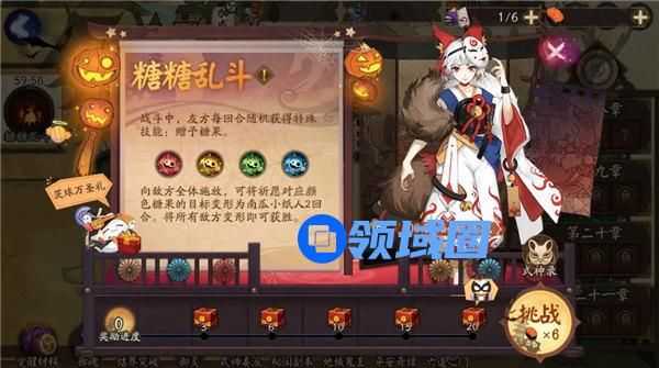 ※战斗中,友方每回合随机获得特殊技能「赠予糖果」,向敌方全体施放,可将祈愿对应颜色糖果的目标变形为南瓜小纸人2回合。所有敌方处于变形状态时,即可获胜,任意变形效果都计入获胜条件。节日妖力加持下的妖怪们实力强大,有信心的大人也可以选择直接击败他们。