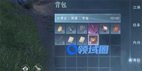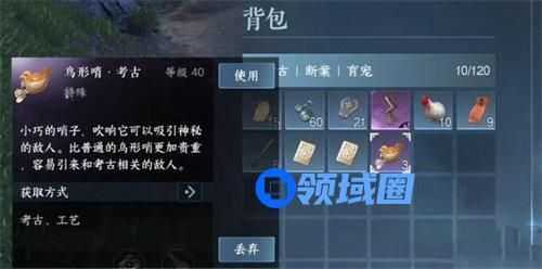 3、将背包打开,在身份中点击考古再点击断案,点击育宠并在里面找到鸟形哨。