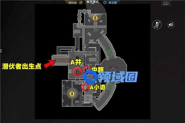 首先,我们来看一下海底研究所的地图布局。通过下图我们发现,A点位于潜伏者出生点下方,即对局中潜伏者出生后面朝方向的右侧。