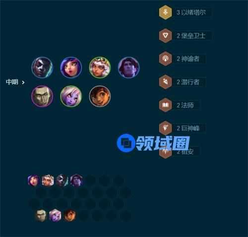 中期3-2正常拉6级,连败开的话可以卡50经济F慢慢上6,吃到8连败在3-5拉7级大搜。如果是均势或优势开局的话,6级即可开始搜牌,前排找妮蔻和宝石开2堡垒,用奇亚娜和艾克开2潜行,挂上米利欧和奶妈开2神谕2巨神峰。