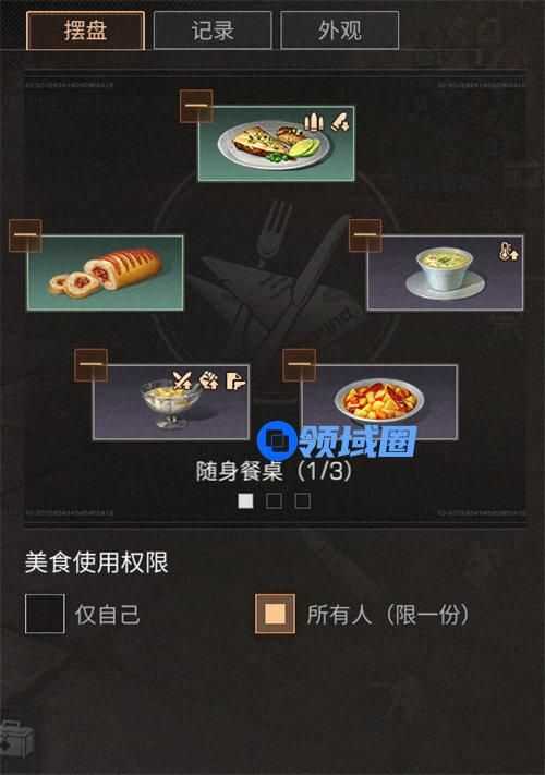 点击摆盘与设置,即可对选择想要享用的食物放上餐桌,同时可以设置美食的使用权限