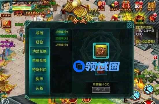 玩家日常获得的经验丹,荣誉章,五连密印等都可以通过此系统合成相应的高等级道具,如功勋章小可以合成功勋章中,功勋章中可以合成功勋章大等,以此类推。