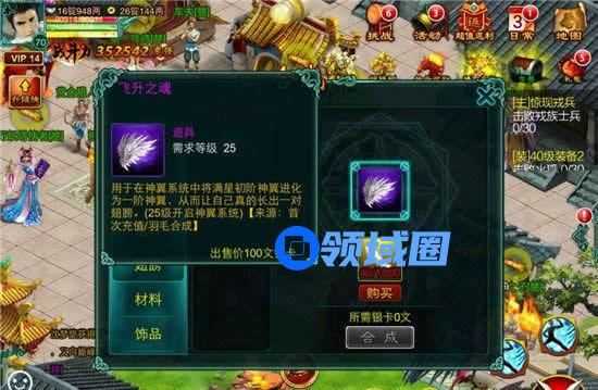 该系统主要是给免费玩家提供初级翅膀的获得途径,玩家通关参与万妖塔、多人本可获得守护之羽。满足相应的数量需求则可获得飞升之魂,获得初级翅膀。