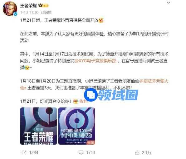 王者荣耀和抖音近日正式官宣,王者荣耀抖音直播将于1月21日全面解放,也就是说,从2024年1月21日开始,全抖音平台的主播都可以开始直播王者荣耀了。下面是王者荣耀官博发布的具体内容: