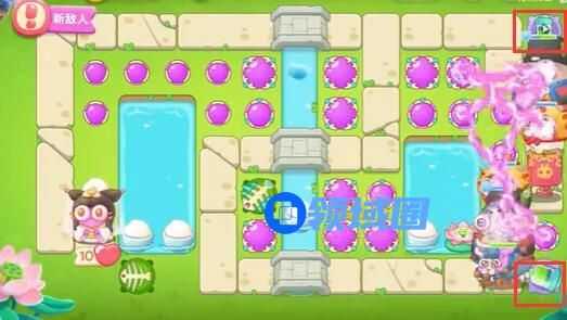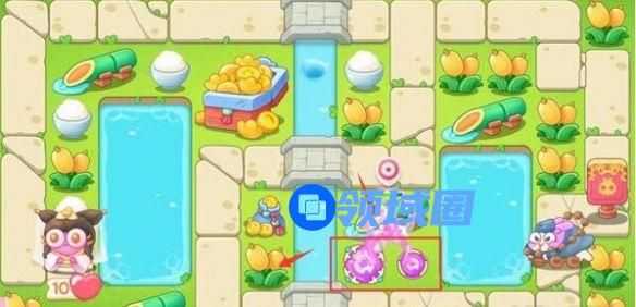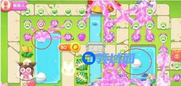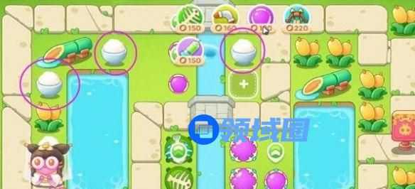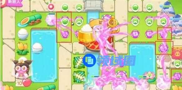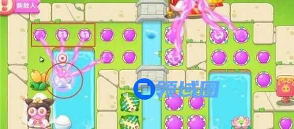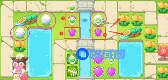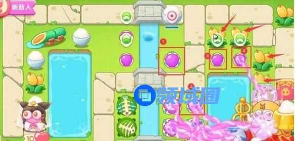 5、第四波开始的时候就把序号1魔法球升级,打掉米饭,接着放置序号2魔法球,右边图开出来后再放置两个魔法球,同时这两个魔法球接着打附近的道具。