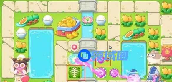 2、在这里放上鱼骨并升最高级,打上面的道具,等待第二波开始后,在序号1标记的地方放魔法球。