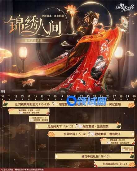 1月10日10:30,限定联动追光活动【山河绣景】上线!全新六星套装及SSR羁绊限时登场!该追光活动每登场25次内必得新限定六星套装部件(直至集齐限定六星套装)。集齐限定六星套装还可激活专属出场动作(摄像机镜头动态动作)【钰绣荧华】,并可在拍照-动态动作里使用。此外,【追光·绣景分解】商店也将同期限时开启,通过分解该限时追光活动内的服饰,可获得限定五星时装部件【星汐之声】、【小幽当家】、【绒团小兔】及拍照背景【仙境漫游】、限定家具、头像装扮、聊天装扮、拍照道具、绣景风向标、心念之蝶、知之钥、金币等材料道具!