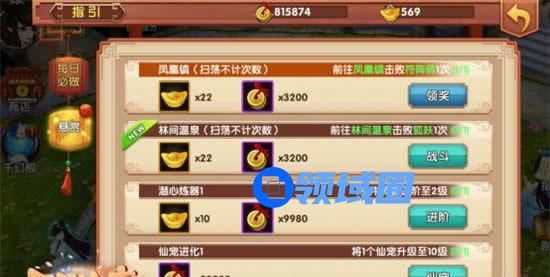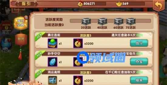 指引系统里面详细的介绍了每日必做任务和悬赏任务。每日必做任务除了常规奖励铜钱和宝箱外,还可以领取活跃奖励,不过活跃奖励只在达到了相应的活跃度时才可以领取。