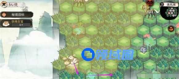 1、进入清风涧秘境,可以看到密境古宝在地图右上角,并且玩家已经进入第一只雷麟马的感应范围,先向下走,躲入草丛,摆脱第一只雷麟马的仇恨。