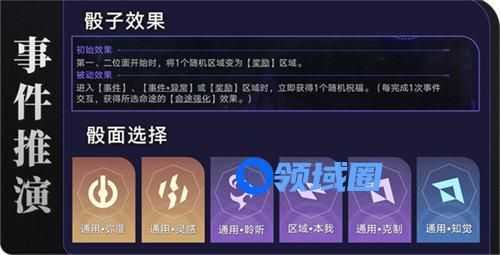 1、推荐使用【事件推演】骰子,骰面选择【[通用·弥漫]、[通用·灵感]、[通用·聆听]、[区域·本我]、[通用·克制]、[通用·知觉]】。多进事件拿祝福。