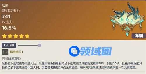 2、武器特效:进行下落攻击时目标命中后,将提高全队中的角色下落攻击伤害,其他的角色下落攻击击中敌人时,还可以恢复装备者的元素能量。
