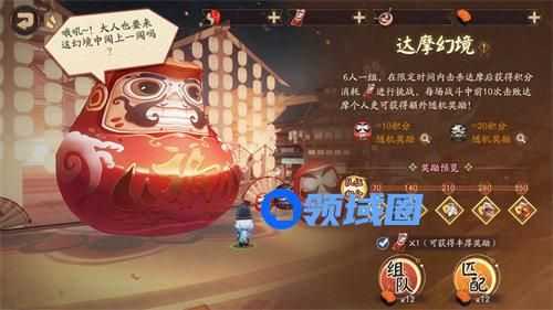 ※达摩幻境:大人每日可获得「达摩礼券」,消耗1张礼券可组队进入达摩幻境,并挑战其中出现的达摩,根据全队在限定时间内获得的挑战积分,将解锁获得被遗忘的绘本、大蛇的逆鳞和逢魔之魂等奖励;进行挑战时,点击战斗界面内的「打鼓」,可消耗1个「鼓点」并直接消灭本场所有达摩。