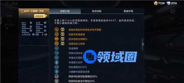 在技能属性方面,AK47-火麒麟-灵狐与AK47-火麒麟几乎保持一致:装备后增加背包步枪子弹数、伤害无距离衰减、连杀信息全局展示、战绩自定义保存等等。尤其是伤害无距离衰减,堪称排位最受欢迎技能之一,这也是火麒麟位居一流英雄级武器的原因之一。除此之外,AK47-火麒麟-灵狐与AK47-火麒麟一样拥有专属套装效果,与沙鹰-火麒麟、尼泊尔-火麒麟在同一背包装备的时候可以触发火麒麟套装属性:主弹匣子弹数+2。