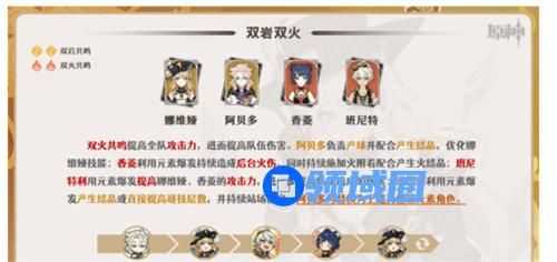 双火共鸣提高全队攻击力,进而提高队伍伤害。阿贝多负责产球并配合产生结晶,优化娜维娅技能;
