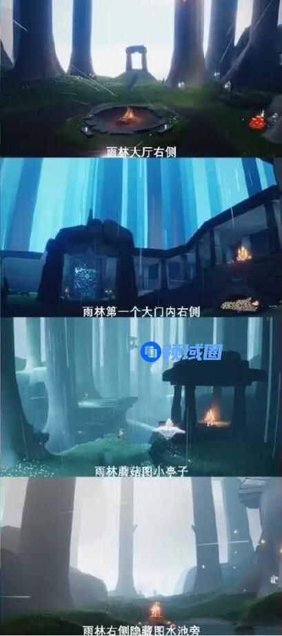 今天是周五,大蜡烛的刷新数会比往常多,今天在云野、雨林、霞谷这三张图中都会有大蜡烛刷新,具体的刷新位置如下图所示:
