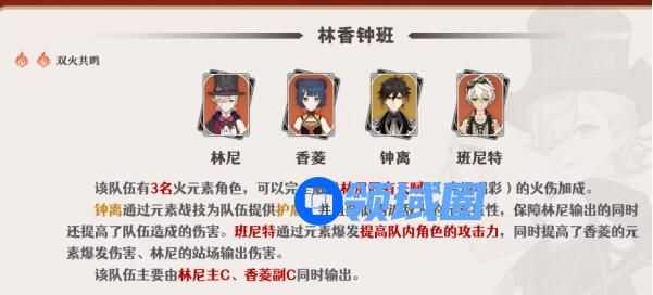 1、三名火元素角色可以触发林尼固有天赋获得火伤加成。