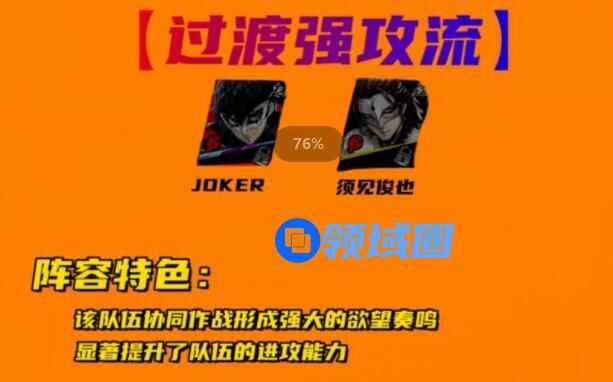 在上面的强力进攻流阵容为凑齐之前可以用这套搭配进行过渡JOKER 与须见俊也两人同为诅咒属性一个群伤能力强一个单体爆发高,两者互相搭配的打怪速度也是非常快的。