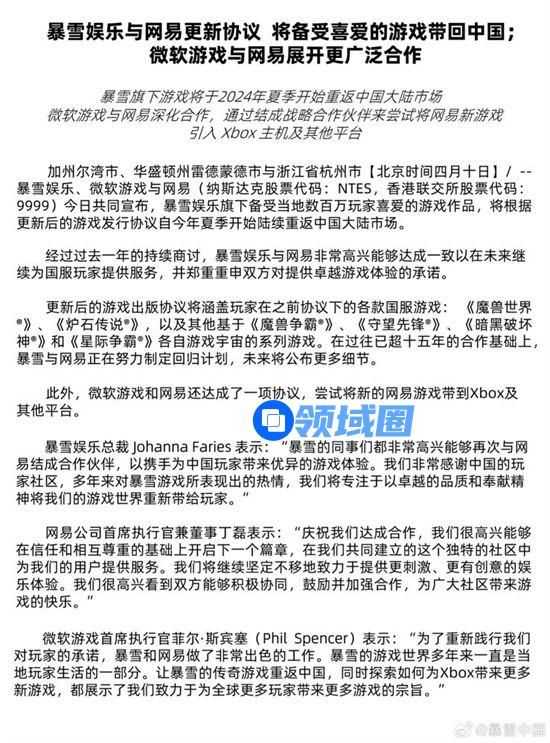 暴雪中国公告称,暴雪旗下游戏将于 2024 年夏季开始重返中国大陆市场,微软游戏与网易深化合作,通过结成战略合作伙伴来尝试将网易新游戏引入 Xbox 主机及其他平台。