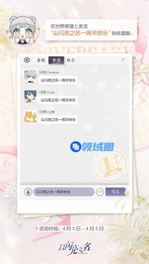 周年贺词活动期间,每日在世界频道发送指定贺词消息,首次发送时都会获得惊喜奖励~