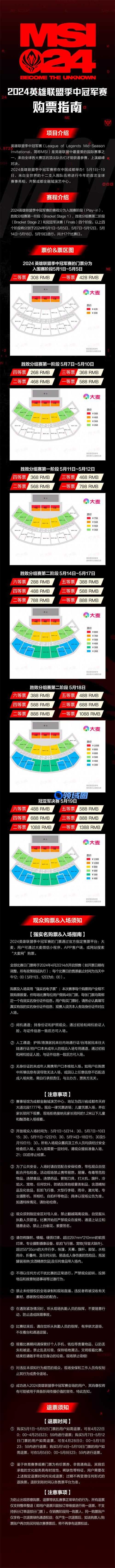 2024英雄联盟msi全部比赛日门票将于4月2日14点开启预售;每个比赛日的售票截止时间为当天中午12:00(5月11日、12日为8:00)。门票通过官方指定售票平台:大麦,用户可通过大麦微信小程序、APP客户端,或网站搜索“大麦网”购票,更多购票详情见下图。