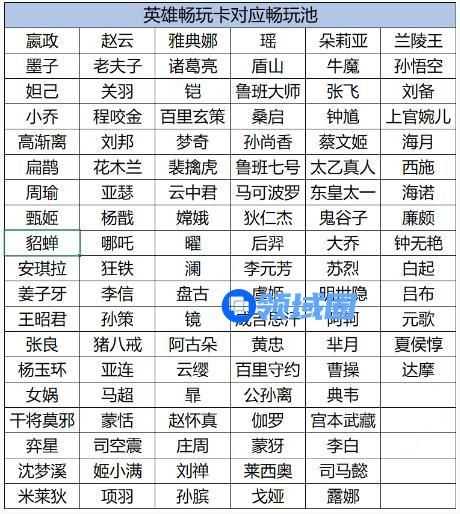 王者荣耀s35赛季英雄畅玩卡对应的畅玩卡池一共有106名英雄可以选择使用,具体的英雄名单如下表所示: