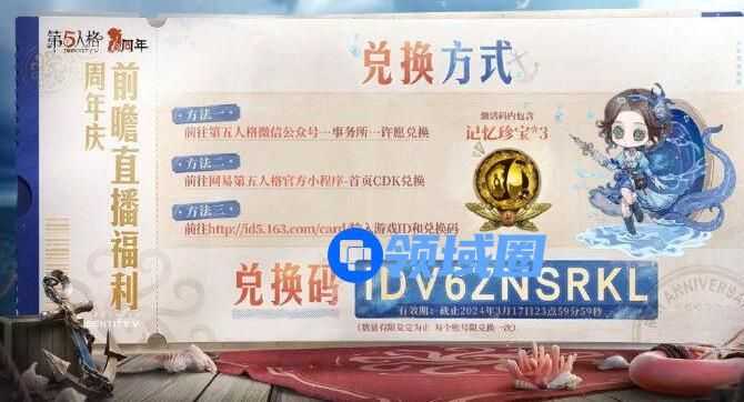 以上就是为大家带来的第五人格六周年前瞻兑换码分享,希望对大家有所帮助。更多精彩内容,敬请继续关注领域圈。